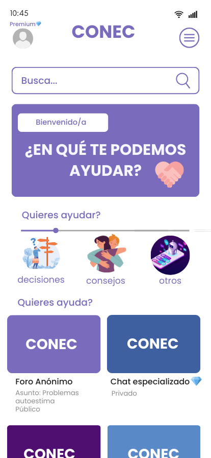 Somos un grupo de 4 alumnas del IES Sivera Font, preocupadas por el bienestar de los jóvenes, por eso hemos creado CONEC, un proyecto integral enfocado en promover y mejorar la salud mental, ofreciendo una app con chats anónimos para prevenir y tratar trastornos como la ansiedad, depresión y estrés, en un mundo cada vez más complejo.